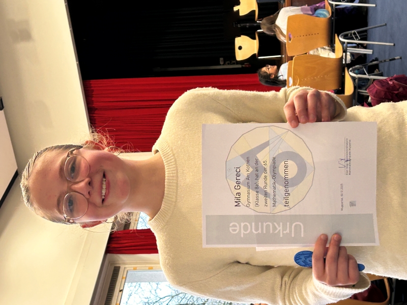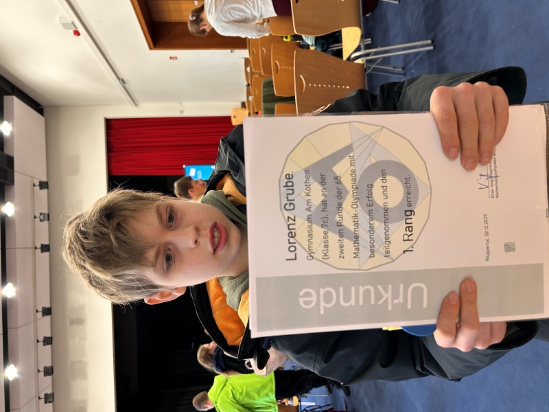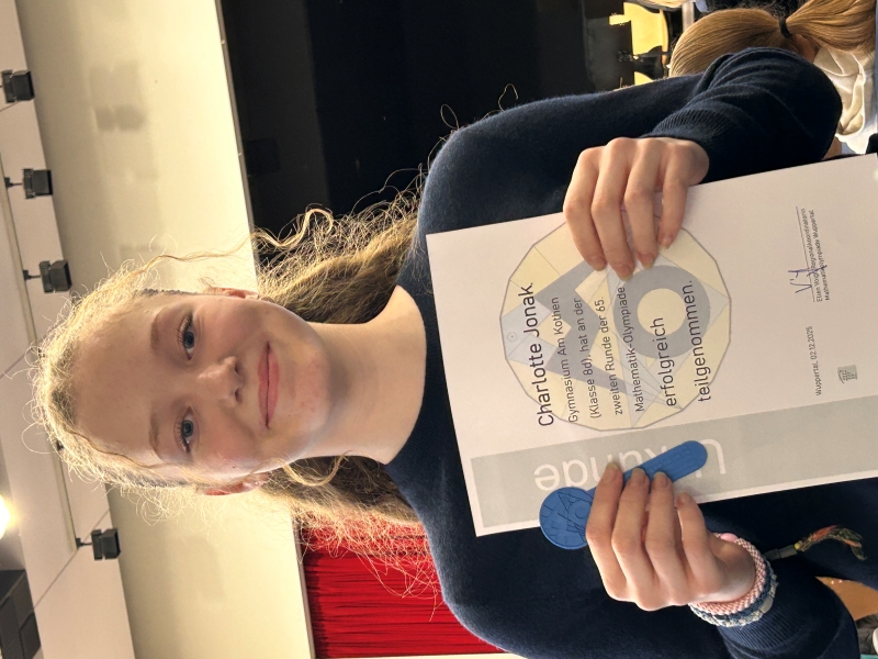 In der 2. Runde nehmen traditionsgemäß viele weiterführenden Schule aus Wuppertal teil. Auch vom Kothen nahmen 20 Mathematik:erinnen der Jahrgangsstufen 5 – 9 an teil. Davon erhielten sechs Kinder eine Urkunde für die „erfolgreiche Teilnahme“. Svea Kruse aus der 6c erhielt den 3. Preis in der Jahrgangsstufe 6. Emil Jeseck (5e) und Lisa Rapoport (6c) erhielten jeweils den 2. Preis aus ihrer Jahrgangsstufe. Ziqing Zhao (6c) und Lorenz Grube (7c) haben den 1. Preis in ihrer Jahrgangsstufe erhalten.