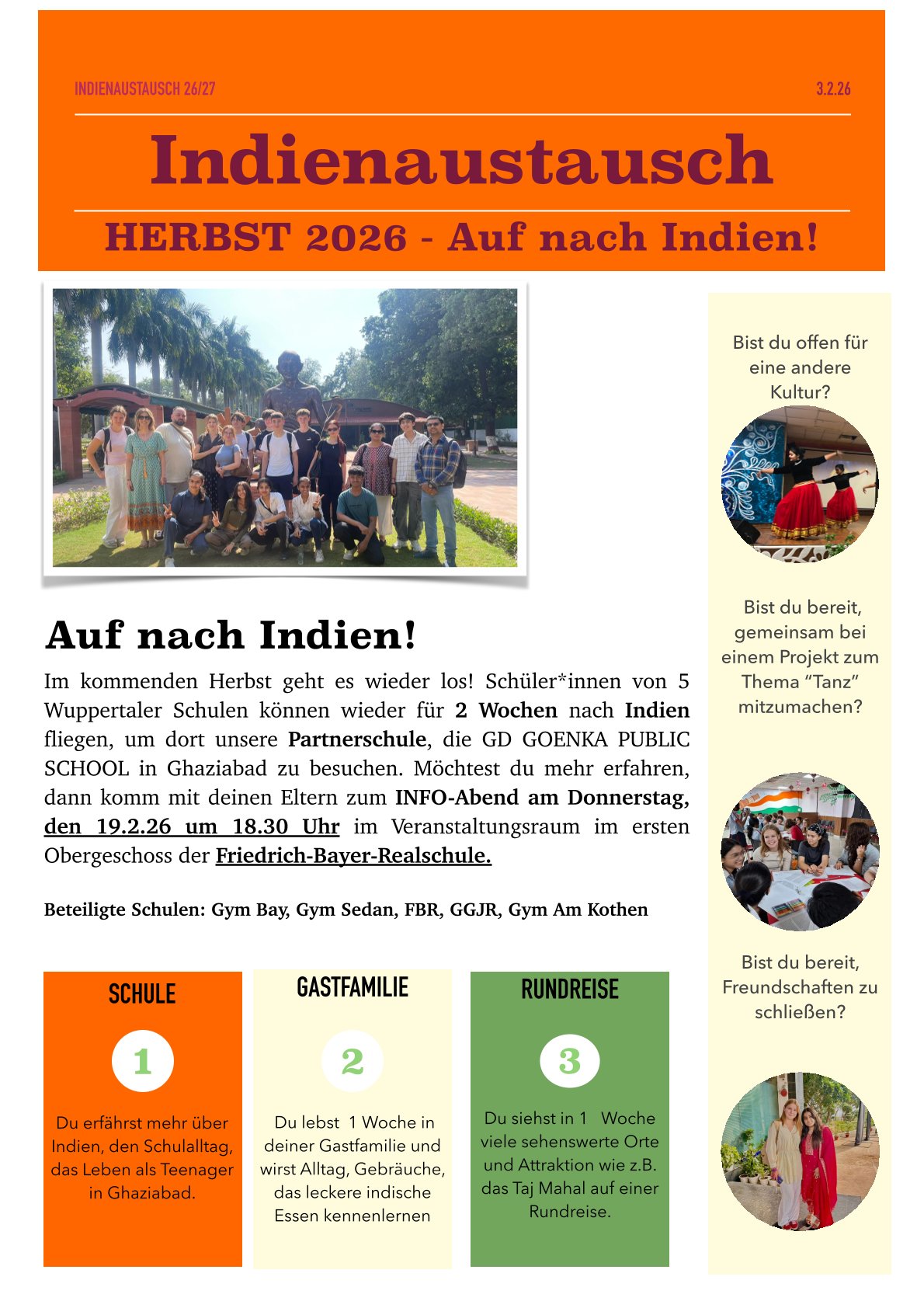 Auch im Schuljahr 2026/27 planen wir wieder einen Austausch mit unserer Partnerschule in Indien. Schüler:innen sowie interessierte Eltern laden wir herzlich zu einem Informationsabend ein.