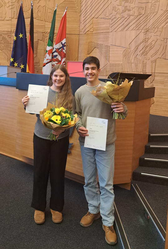 Regionalwettbewerb „Jugend debattiert“ in Düsseldorf hat Elisa Hamann (9d) den ersten Platz und Mert Köksal (ebenfalls 9d) den zweiten Platz belegt. Nach zwei Qualifikationsrunden, in denen sie die Juror:innen überzeugen konnten, ging es im Finale um die Frage: „Soll für Privatgärten eine insektenfreundliche Gestaltung vorgeschrieben werden?“. Insgesamt haben 32 Debattant:innen von 15 Schulen teilgenommen – eine Spitzenleistung also, mit der sie sich für die nächste Ebene, die Landesqualifikation in Bochum am 25.3. qualifiziert haben.
