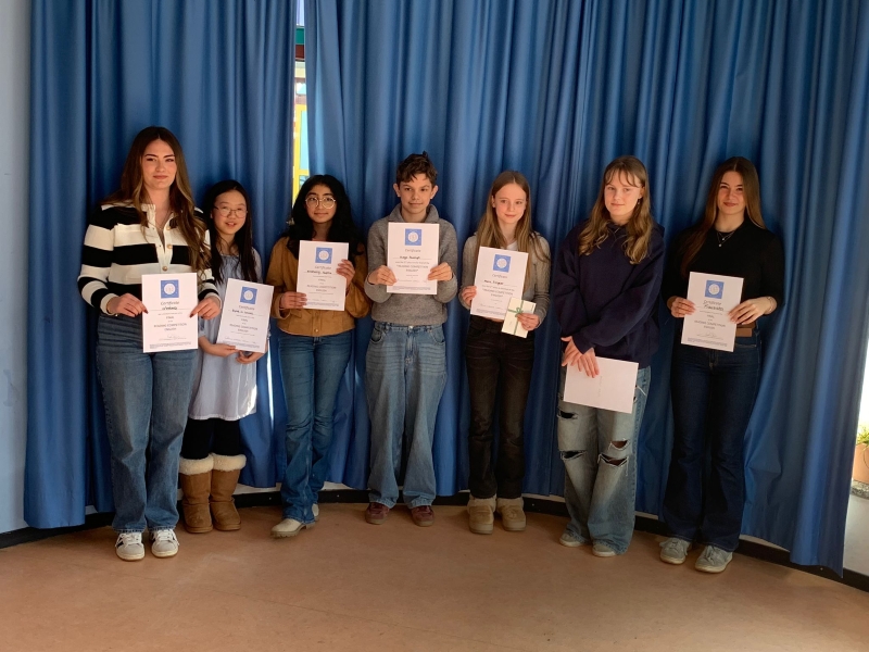 Keine leichte Aufgabe für die Jury aus den fünf ausgezeichneten Beiträgen eine:n Gewinner:in zu küren. Nora kann voller Stolz auf ihre Leistung, einen hervorragenden 1. Platz und einen aufregenden Tag blicken, der von ihrer Klassenkameradin Madalina begleitet wurde. Als Erinnerung bekamen alle Teilnehmenden eine Urkunde überreicht, die drei Erstplatzierten außerdem einen Buchgutschein.